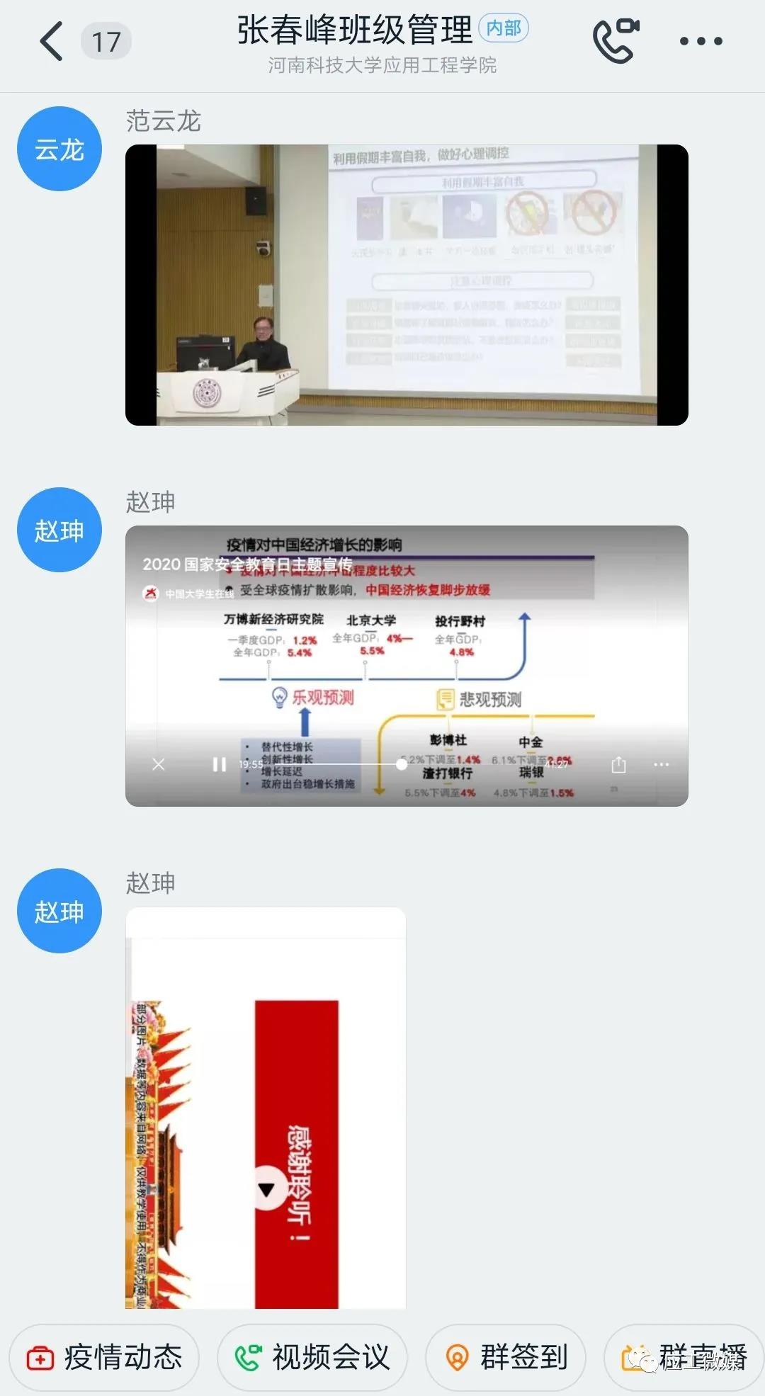 各个专业和班级分别由各自辅导员组织开展“全民国家安全教育日”线上班会。班会从“何为国家安全”“当前国际国内形式”“危害国家安全的行为及危害”“如何维护国家安全”“谁来维护国家安全”五方面来进行宣传和教育,确保将主题活动落到实处,增强学生的国家安全意识。