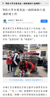 赵一鸣同学,男,现居住河南省漯河市,是金沙威尼斯欢乐娱人城车辆工程专业大三的一名学生党员。疫情爆发后,该同学通过当地社区的红色召集令,联系当地的社区党组织并成为一名社区的疫情防控员。赵一鸣主要负责为隔离人员送生活必需品、在疫情防控宣传点介绍防控知识、到小区防控点值班、搬运社会爱心人士捐赠的物资等工作。每天早上8点半赵一鸣都会到友爱街社区居委会报到,坚持做好社区安排的工作,用自己的行动践行了一名共产党员的责任和担当。该同志的事迹在漯河先后被漯河新闻、漯河晚报、中原经济网、人民网等多家媒体报道。