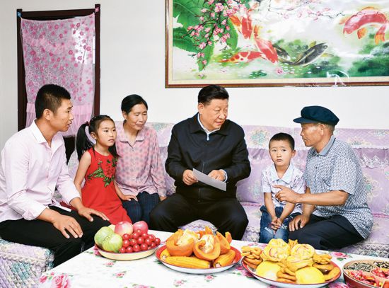 2019年8月19日至22日,中共中央总书记、国家主席、中央军委主席习近平在甘肃考察。这是21日上午,习近平在武威市古浪县黄花滩生态移民区富民新村村民李应川家,同李应川一家拉家常。 新华社记者 谢环驰/摄