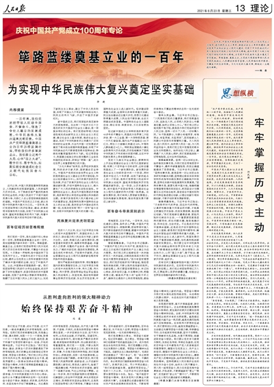 一百年来,中国共产党团结带领中国人民,以马克思主义为指导,进行新民主主义革命,推进社会主义革命和建设,推动改革开放和社会主义现代化建设,实现了中华民族近代以来从落后时代到赶上时代的伟大跨越,进而实现了从赶上时代到引领时代的伟大跨越,为实现中华民族伟大复兴奠定了坚实基础。筚路蓝缕、奠基立业,正是我们党团结带领人民为实现民族独立、人民解放和国家富强、人民幸福而艰辛探索、不懈奋斗的生动写照。今天刊发的几篇文章,围绕这一主题进行阐释。