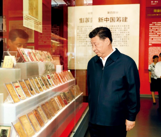2019年9月12日,中共中央总书记、国家主席、中央军委主席习近平视察中共中央北京香山革命纪念地。这是习近平在香山革命纪念馆参观《为新中国奠基》主题展览。 新华社记者 黄敬文/摄